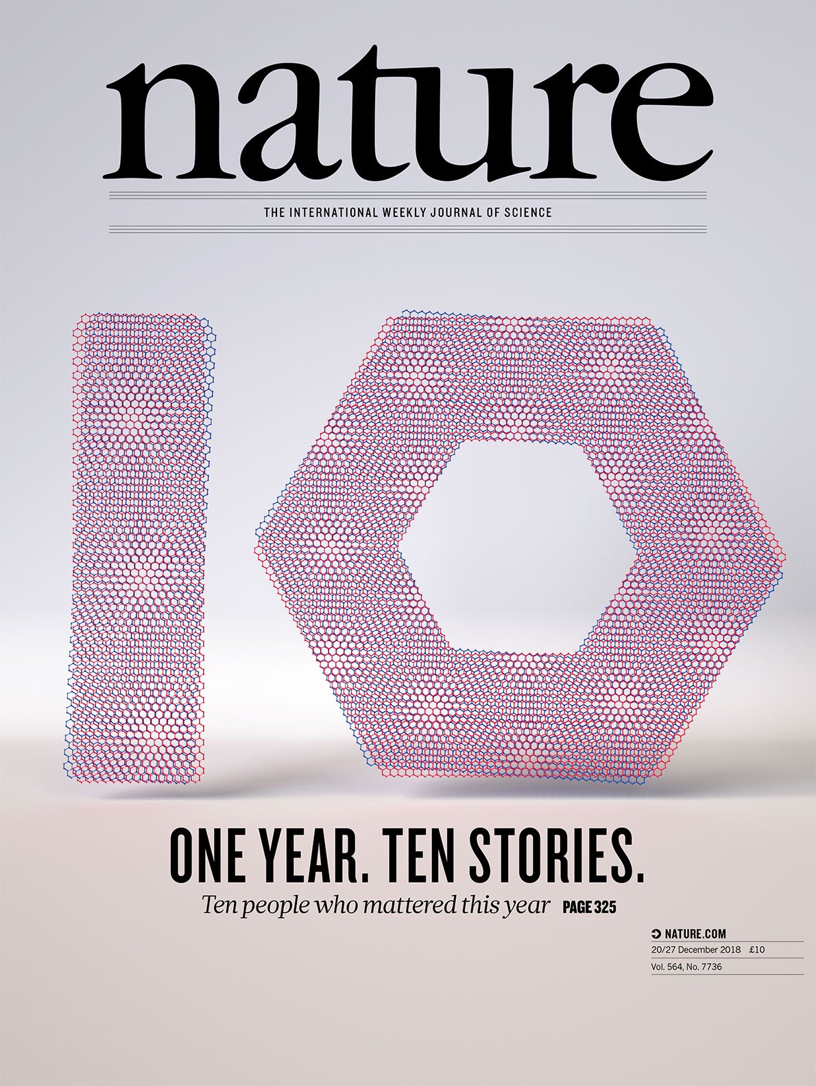 今年的封面图片明显指向曹原的成果。数字“10”中的“0”被处理成一个正六边形,宛如构成石墨烯的碳环结构。再仔细看,整个数字“10”由2层蜂窝状的小小正六边形填涂而成,分别为红色和蓝色,两层之间有微小的夹角,使得图像出现了重影。这点出了赋予石墨烯超导能力的“魔角”。