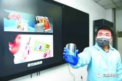 2018年第四季度,合肥微晶石墨烯纳米银线复合柔性透明导电膜成功量产,图为吕鹏展示应用此项技术的柔性触摸屏产品