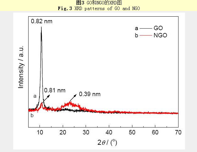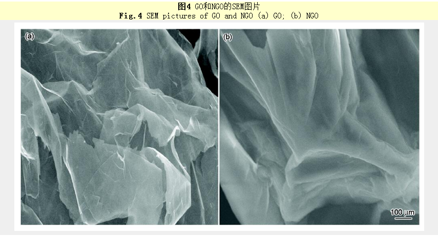 由图4a可以看出,GO的表面具有明显的褶皱,呈片层结构。图4b表明NGO表面结构形貌相较于GO更加粗糙,因为经过乙二胺改性后其表面接枝有大量氨基。对比图4a和4b可见,虽然NGO较GO的片层结构更加紧密和平整,但是GO其特有的二维片层状结构并未因氨基化改性而改变。