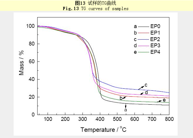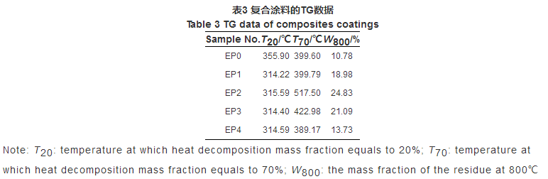 水性环氧复合涂料的TG曲线如图13所示,数据列于表3。由表3可以看出,与其他试样相比EP0的T20最大,为355.90℃,而其W800却最小,仅为10.78%;添加了PEPA/ATP/NGO复合填料的EP1试样,其T20为314.22℃,比EP0降低了41.68℃,但是W800却提高到18.98%。这表明,在此温度下复合填料中的PEPA和NGO提前分解,起膨胀阻燃作用,提高了试样的热稳定性。EP2试样的T70为517.50℃,W800为24.83%,比EP0和EP1都有较为明显的提高。其原因是,NGO独特的二维层状结构和表面的丰富的活性氨基使其与环氧树脂之间形成较强的界面作用和交联结构,形成一层致密的保护膜,隔绝热量,提高了试样的热稳定性。