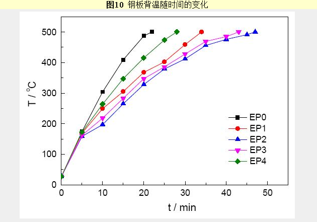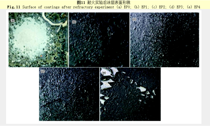 由图10可以看出,与环氧清漆涂层试样(EP0)相比,环氧复合涂层试样(EP1、EP2、EP3、EP4)的耐火时间有了较为明显的延长,应该归功于PEPA/ATP/NGO复合填料的添加。这表明,PEPA/ATP/NGO复合填料能明显提高水性环氧涂层的防火性能。对于环氧复合涂层试样,在5min内钢板背面的温度迅速升高到250℃左右,此时复合涂层中的膨胀阻燃体系发挥作用。随着复合填料的增加复合涂层中NGO和ATP的作用使涂层表面的缺陷减少,涂层的致密性提高,在耐火燃烧测试时形成更加连续且致密的炭层,膨胀效果更加明显(图11c),阻止热传递并缓解了内部涂层的损坏,延长了涂层的耐火时间。此外,NGO能改善复合涂层的抑烟性能,阻碍一氧化碳等挥发性降解产物的散逸,降低火灾危险。当PEPA/ATP/NGO复合填料的添加量继续增大时耐火极限开始下降,因为添加过多的PEPA/ATP/NGO复合填料使炭层的强度提高,抑制了炭层的膨胀,使导热系数增大而降低了防火性能。此外,添加过量的填料导致其在固化过程中沉积于涂层表面,在涂层表面产生微孔和微裂纹和在膨胀炭层表面出现孔洞和缺陷,不能有效阻止热传递,明火燃烧甚至使涂层脱落(图11e),导致复合涂层的耐火时间减少。