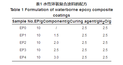 在10 g水性环氧树脂(美国气体化学,Ar555)中加入2.5 g蒸馏水进行稀释;然后将其倒入球磨罐中,再分别加入不同质量(P/B=0、0.15、0.20、0.25、0.30)的防腐防火填料。对混合物进行球磨使填料充分分散后加入2.5 g的固化剂(美国气体化学,Aq419),用磁力搅拌器搅拌使其混合均匀,其具体配方在表1中给出。将尺寸为50 mm ×50 mm的钢片进行喷砂处理, 然后将涂料喷涂于钢片上, 在室温干燥固化后得到防腐防火一体化水性环氧涂层试样。