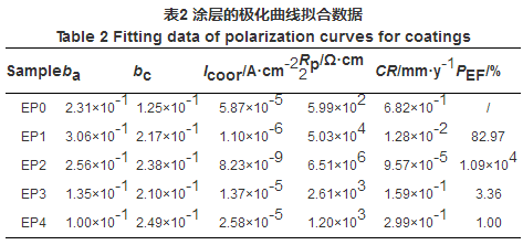由图8和拟合数据表2可见,在水性中加入PEPA/ATP/NGO复合填料后复合涂层的防腐蚀性能有所提高,且随着PEPA/ATP/NGO复合填料含量的增多涂层的腐蚀电流密度降低、极化电阻增大、电位正移、腐蚀速率减小。复合涂层试样EP2 (复合填料添加量为20%)的腐蚀电流密度最低,为8.23×10-9 A·cm-2,极化电阻最大,为6.51×106 Ω·cm2,腐蚀速率最小,为9.57×10-5 mm·y-1,防护效率最高,为1.09×104%,说明这种复合涂层的防腐蚀效果最佳。继续增加PEPA/ATP/NGO复合填料的用量,腐蚀电流密度开始升高、极化电阻下降,腐蚀速率增大。其原因是,添加适量的复合填料可提高复合涂层的阻隔性能,还能与在金属腐蚀过程中产生的金属离子络合,生成钝化保护膜覆盖于金属基体表面,进一步提高复合涂层的防腐蚀性能;而加入过多的复合填料则因填料团聚致使涂层内部填料分布不均,固化后涂层表面易产生颗粒状沉积、进而产生微孔和微裂纹,导致复合涂层综合性能下降,影响其防腐蚀性能。