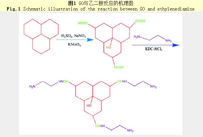 将200 mg的GO加入到装有100 mL N,N-二甲基甲酰胺(DMF)的三口瓶中,在室温下机械搅拌1 h后将300 mL乙二胺(AR)加入到体系中继续搅拌1 h,然后再加入10 mg偶联剂(EDC-HCL)。将混合液转移至60℃水浴中继续搅拌,并安装回流冷凝装置反应6 h。将反应后得到的混合液用无水乙醇(AR)洗涤5次以完全除去过量的乙二胺。最后,将产物在50℃下充分干燥,得到氨基功能化氧化石墨烯。其制备过程和反应机理,如图1所示。