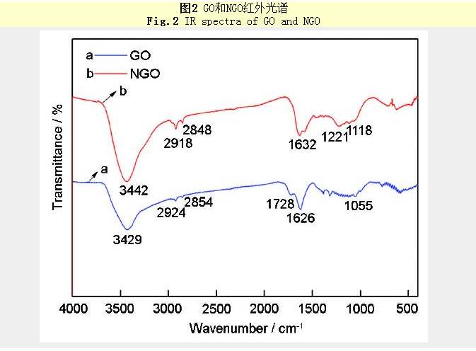 图2曲线a上3429,1728,1626和1055 cm-1处的吸收峰分别对应GO中的O-H、C=O、C=C和C-O的伸缩振动峰。曲线b上O-H的伸缩振动峰出现在3442 cm-1处,并且振动峰更强。其原因是,N-H键的引入使O-H键的振动峰发生偏移,且N-H的伸缩振动峰与O-H键的伸缩振动峰发生重叠使峰值变强。曲线a上1728 cm-1处的峰对应于C=O键的伸缩振动,在曲线b上该峰出现在1632 cm-1处,因为在GO功能化过程中-COOH转化为-CONH-。2924 cm-1和2854 cm-1处的峰是C-H的伸缩振动峰,曲线b上这两处的峰均有不同程度的增强,因为在GO氨基功能化过程中引入了新的带有C-H键的基团。曲线a上C-O的峰,即1055 cm-1处的峰对应于曲线b上的1118 cm-1,这是N-H的影响使峰的位置改变。同时,曲线b上1221 cm-1的峰为C-N键的不对称伸缩振动峰。上述结果表明,实验中已经制备出GO并对其表面进行氨基化改性得到了NGO。