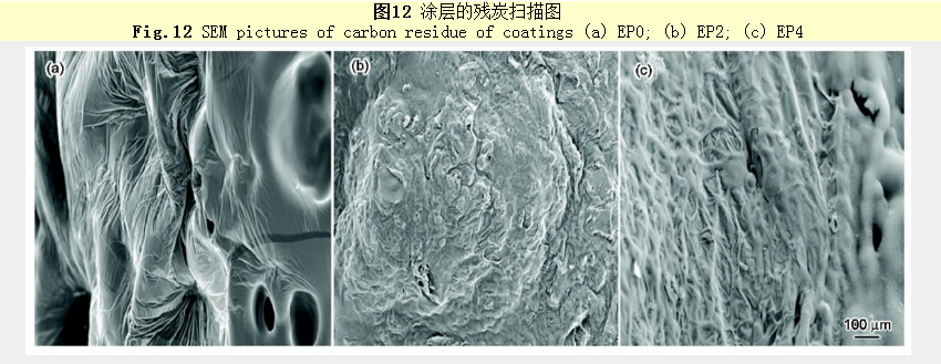 从图12a可以看出,水性环氧清漆表面的炭层基本上没有膨胀,但是出现微孔。其原因是,环氧树脂固化时表面易出现微孔,EP0产生的气体通过表面的微孔释放到空气中,使炭层无法覆盖在材料表面,影响了材料的阻燃性能。从图12b可见,EP2试样充分燃烧后在表面产生了明显的膨胀炭层,且表面几乎没有微孔和缺陷。其原因是,NGO和ATP的加入提高了涂层的致密性,且NGO表面的活性氨基与水性环氧树脂中的环氧基团进行交联复合而形成一层致密的保护膜。在NGO和PEPA的协同阻燃作用下产生的炭层也更加致密连续,使阻燃性能提高。但是,随着PEPA/ATP/NGO复合填料继续增加炭层的膨胀率反而下降,并且在膨胀炭层表面出现明显的裂痕和缺陷(图12c)。其原因是,添加过多的PEPA/ATP/NGO复合填料使炭层的强度提高,EP4中NGO和PEPA分解产生的NH3、CO2、H2O等不可燃气体不能有效地促进基体成炭,使炭层的膨胀性下降,表面炭层缺陷增多,涂层的阻燃性能下降。