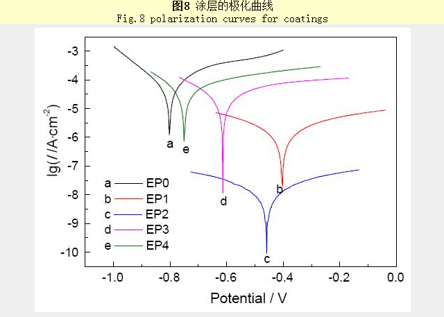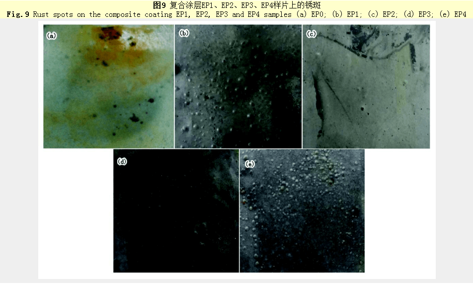 在涂层样片喷涂使其厚度为(30±3) μm,以质量分数为5%的NaCl溶液为基础 连续不间断地喷雾400 h,观察样片的表面是否腐蚀。从图9可见,与清漆涂层EP0相比,复合涂层EP1、EP2、EP3、EP4的样片上锈斑明显较少,说明复合填料能明显提高涂层的防腐性能。其原因是,复合填料中的NGO具有二维层状结构,分布在涂层中能填补涂层表面微孔,阻隔腐蚀离子透过涂层,进而提高金属基体的防腐能力,在涂层盐雾测试中出现的锈斑减少。而复合涂层EP2的样片基本没有明显的锈斑和起泡,说明该组的防腐性能优于其它组,与电化学的分析结果一致。其原因是,ATP中的P3O105-能与水性环氧树脂中的极性基团(羟基、环氧基)发生络合,加入适量的ATP能在一定程度上改善涂层的湿附着力,使阴极极化度高增强,涂层表面的起泡也会相应减少。这表明,加入适量的PEPA/ATP/NGO复合填料有助于提高涂层的致密性和改善涂层的湿附着力,进而提高复合涂料的防腐能力。