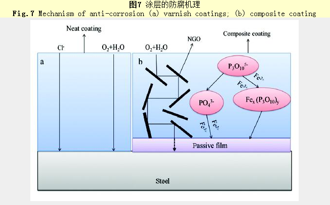图6给出了复合涂层的阻抗值随时间变化的整体趋势。可以看出,水性环氧复合涂层的阻抗值普遍高于水性环氧清漆涂层,因为NGO二维层状结构的阻隔性能降低了缓腐蚀粒子的运输速度(图7)。从图6还可以看出,在浸泡过程中复合涂层试样EP2的阻抗值一直高于其他复合涂层(EP1、EP3、EP4)。其原因是,当填料的添加量过低时不能很好的弥补涂层固化时产生的缩孔,使涂层表面存在一定的缺陷[17];而添加过多的填料导致其在水性树脂基体中的分散性降低,使复合涂料的成膜性能降低、涂层表面缺陷增多和阻隔性能下降。以上结果表明,复合涂层试样EP2(填料添加量为20%)的防腐性能最优。