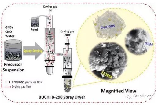 第一步,研究人员能够以受控方式均匀混合铜和镍,以实现混合金属。基于纳米铸造(一种生产介孔材料的方法)它们产生结构化的纳米多孔混合金属氧化物颗粒,由于它们广泛的孔网络具有非常高的活性反应区域,用于与来自电池电解质的锂离子交换。然后,科学家们采用喷雾干燥程序将混合的金属氧化物颗粒与薄石墨烯层紧密包裹在一起。