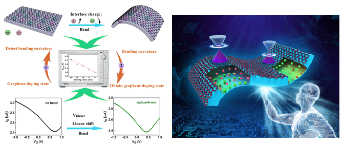 针对上述问题,西安交通大学材料学院功材中心设计出一种新型全无机柔性石墨烯场效应晶体管( GFET ),利用纯机械应变和铁电薄膜 Pb 0.92 La 0.08 Zr 0.52 Ti 0.48 O 3 的挠曲电效应成功地实现了石墨烯掺杂浓度的可控,发现石墨烯的狄拉克点( V Dirac )随着 GFET 弯曲半径(正向弯曲或反向弯曲)呈线性变化。相比于其他调控石墨烯掺杂的方法,本工作具有以下优点: 1 )避免了杂化掺杂对石墨烯造成的破坏以及化学修饰掺杂带来的其他物质吸附; 2 )可逆、可控的; 3 )柔性的。基于以上的优点,我们所设计的全无机柔性石墨烯场效应晶体管不仅可以通过弯曲机械应力调控石墨烯掺杂,而且还可以根据柔性铁电栅 GFET 的 V Dirac 变化来检测样品的弯曲状态。