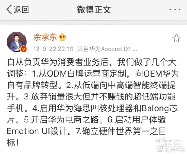 余承东接手华为手机业务后,给华为制定了七条重要调整战略。余承东在2012年曾在微博中公开了这七条战略。