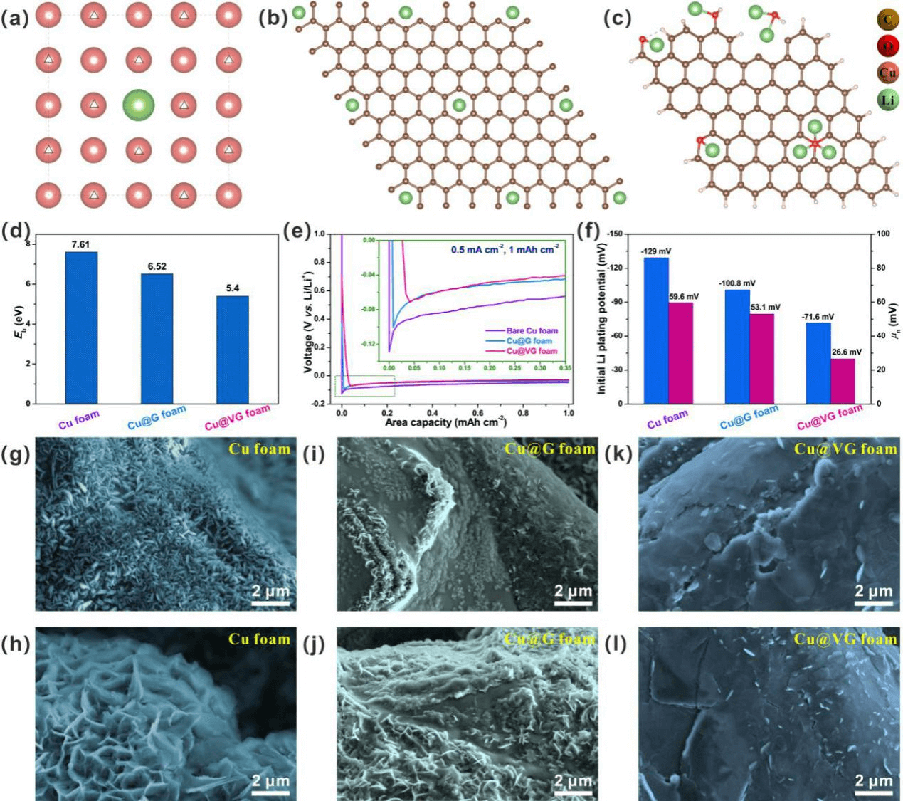 Fig. 2. Cu@VG的亲锂行为。(a) 锂和纯的泡沫铜的结合模型图。(b) 锂与平面石墨烯的结合模型图。(c) 锂和富含缺陷石墨烯的结合模型图。(d) 锂和泡沫铜、平面石墨烯以及富含缺陷石墨烯的结合能。(e) 纯的泡沫铜、Cu@G和Cu@VG的电压-容量曲线。(f) 纯的泡沫铜、Cu@G和Cu@VG的初始形核电位和形核过电位。(g, h) 沉积容量为1mAh/cm2和5mAh/cm2时的Li/Cu foam形貌。(i, j)沉积容量为1mAh/cm2和5mAh/cm2时的Li/Cu@G 形貌。(k, l) 沉积容量为1mAh/cm2和5mAh/cm2时的Li/Cu@VG 微观形貌。