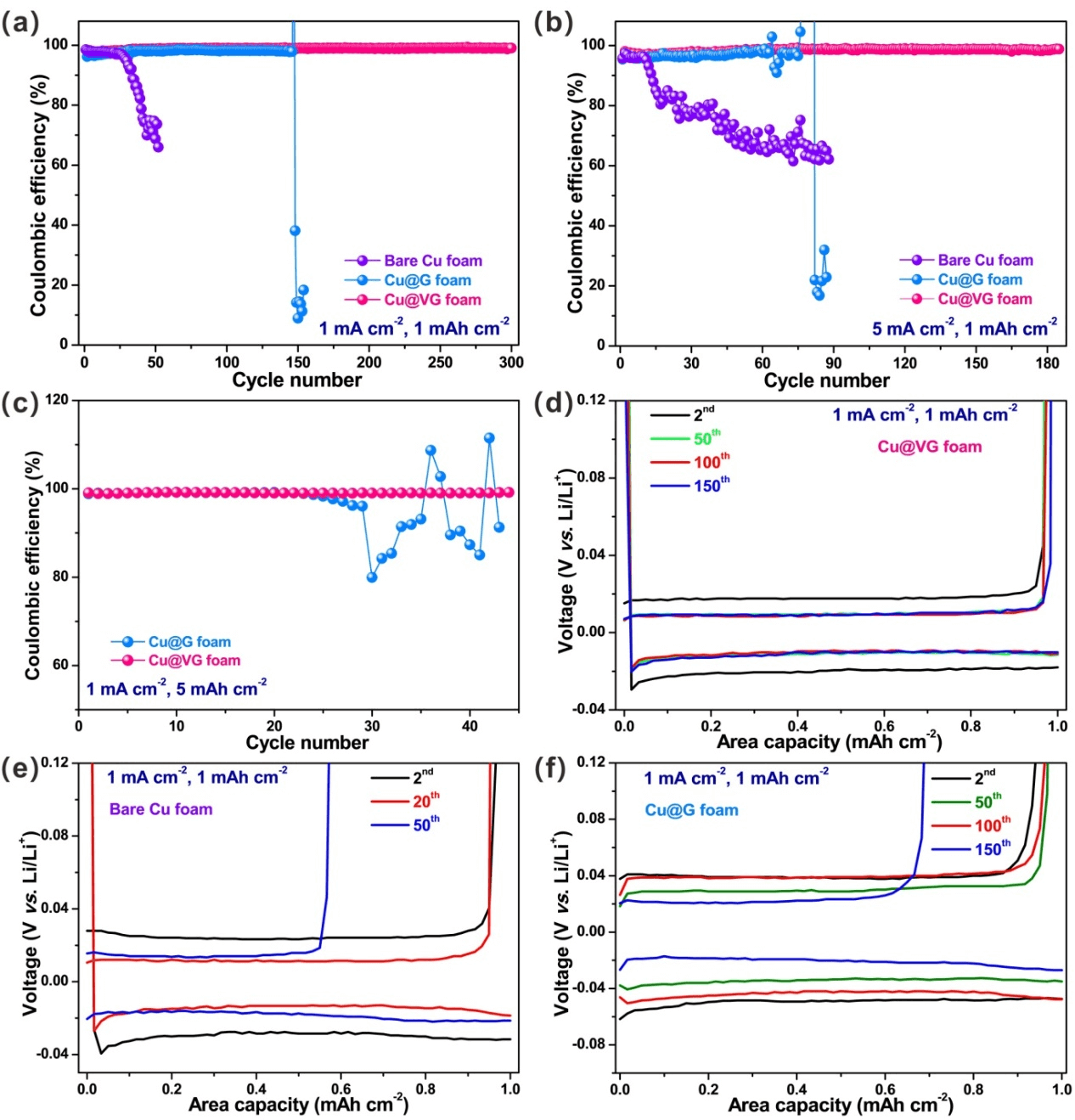 Fig. 3. Cu@VG的库仑效率和电压-容量曲线。(a) 纯的泡沫铜、Cu@G和Cu@VG在1mA/cm2 的电流密度和1mAh/cm2的沉积量情况下的库伦效率。(b) 纯的泡沫铜、Cu@G和Cu@VG的库伦效率(5mA/cm2/1mAh/cm2)。(c) Cu@G和Cu@VG的库伦效率(1mA/cm2/5mAh/cm2)。(d) Cu@VG的容量-电压曲线。(e)纯的泡沫铜的容量-电压曲线。(f) Cu@G的容量-电压曲线。