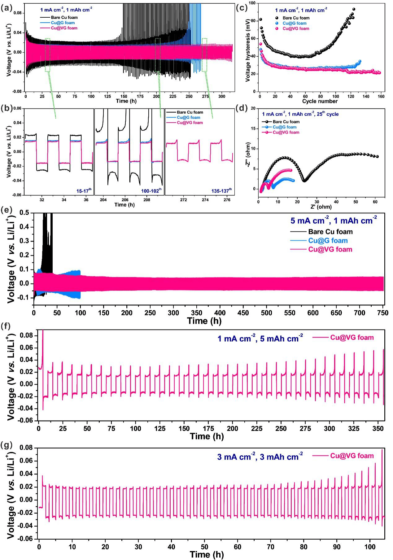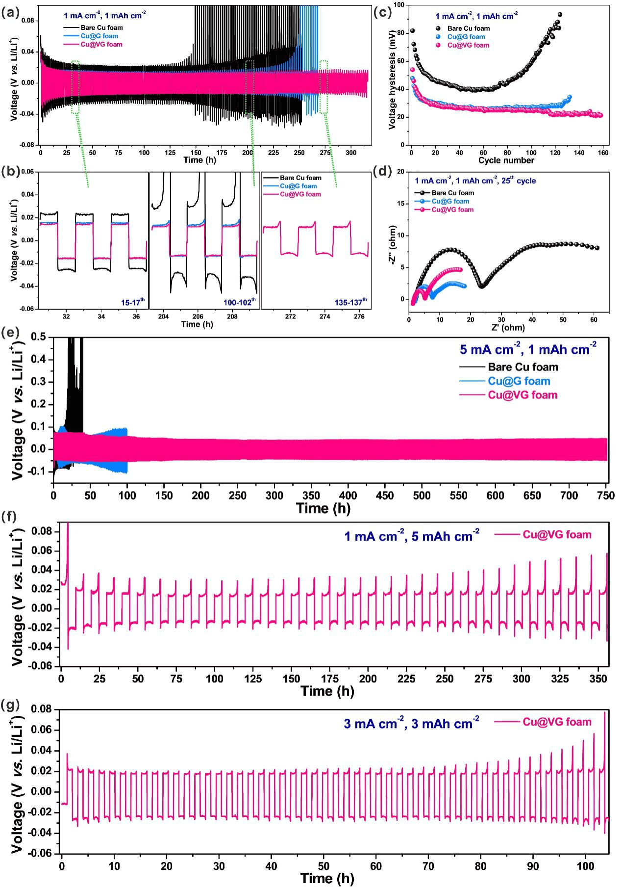 Fig. 4. Cu@VG@Li 对称电池的循环稳定性。(a) 纯的泡沫铜、Cu@G和Cu@VG的循环稳定性(1 mA cm-2/1 mAh cm-2)。 (b) 纯的泡沫铜、Cu@G和Cu@VG的电压迟滞。 (c) 纯的泡沫铜、Cu@G和Cu@VG不同循环次数的电压-时间曲线。(d) 纯的泡沫铜、Cu@G和Cu@VG循环25圈的交流阻抗谱。 (e) 纯的泡沫铜、Cu@G和Cu@VG的电压-时间曲线 (5 mA cm-2/1 mAh cm-2)。 (f) Cu@VG的恒流循环曲线 (1 mA cm-2/5 mAh cm-2)。(g) Cu@VG的恒流循环曲线 (3 mA cm-2/3 mAh cm-2)。