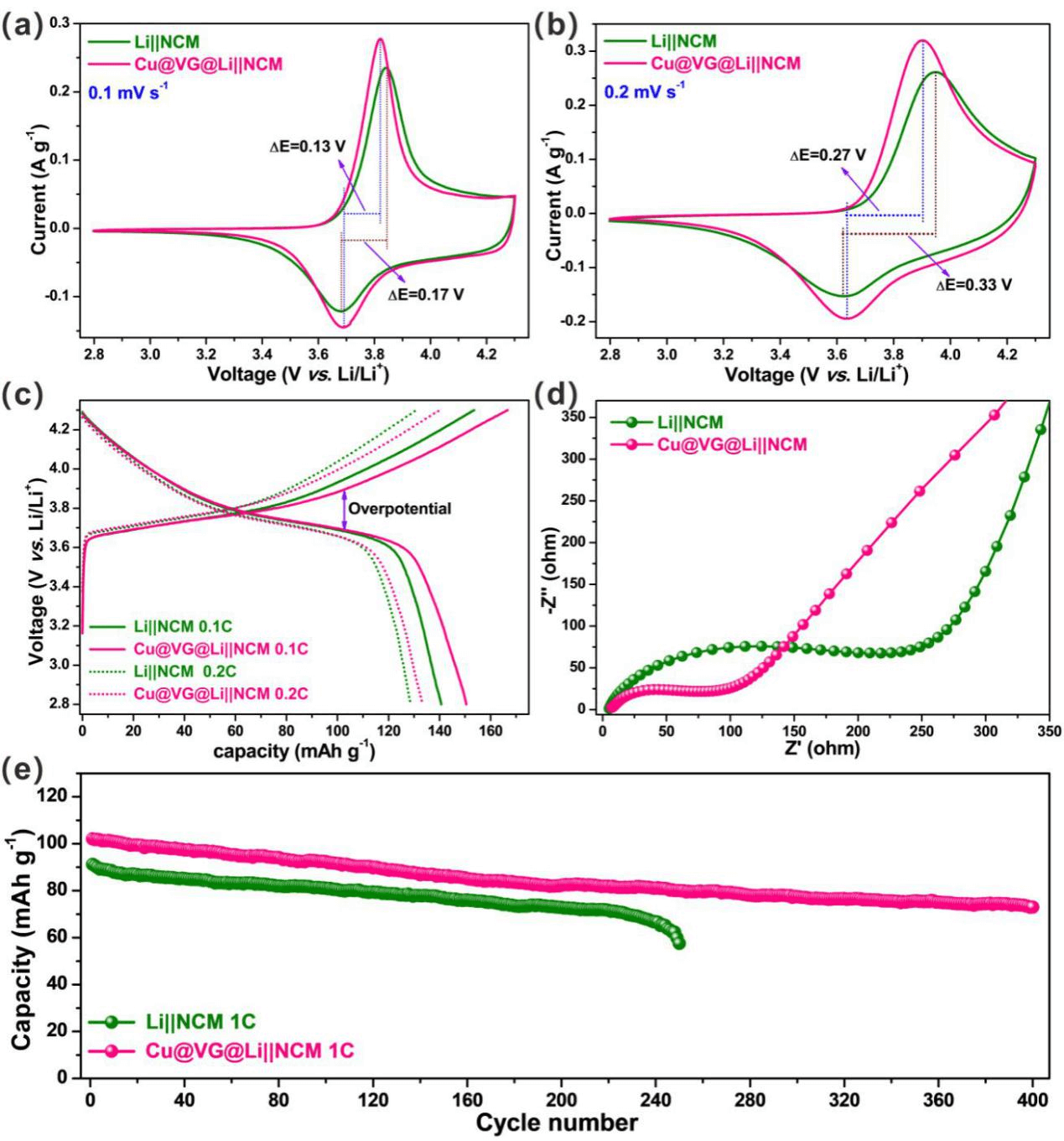 Fig. 5. Cu@VG@Li||NCM全电池电化学性能。(a) Cu@VG@Li||NCM 和 Li||NCM 全电池的循环伏安曲线(0.1mV s-1)。 (b) Cu@VG@Li||NCM 和 Li||NCM 全电池0.2mV s-1的循环伏安曲线。 (c) Cu@VG@Li||NCM 和 Li||NCM 全电池在0.1C和0.2C电流下的充放电曲线。(d) Cu@VG@Li||NCM 和 Li||NCM 全电池10圈循环后的交流阻抗谱。(e) Cu@VG@Li||NCM 和 Li||NCM 全电池的循环稳定性。