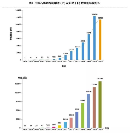 通过对石墨烯中国专利、论文进行检索,共检索到石墨烯中国专利申请43988件,论文累计发表6万余篇,总体而言,我国石墨烯专利论文数量呈指数增长趋势。从专利论文趋势图可以看出,我国石墨烯专利的申请与受理始于本世纪初,从2009年开始,我国石墨烯专利申请数量一直处于快速增长态势。中国政府、科研机构以及相关企业近年来对石墨烯相关技术一直保持高度的重视,国内石墨烯研发的高潮持续不减。2016年石墨烯专利申请数量已达到12420件,2017年专利申请量略有减少为11430件。目前,石墨烯专利申请技术方向主要集中在:以石墨为原料制备石墨烯的技术及工艺;石墨烯在储能、涂料、传感器等领域的应用:CVD制备石墨烯及其转移技术。