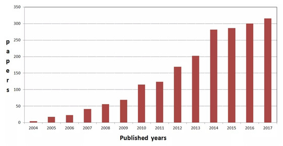 图表2:印刷电子研究论文发表年代分布(国际Web of Sciences统计数据)