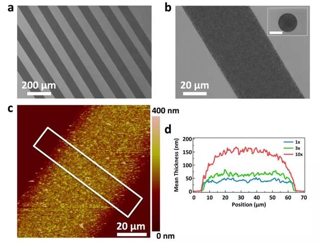 图3. HDMS处理Si/SiO2表面喷墨打印石墨烯的形貌特征。扫描电子显微图(a)的多个印刷线条和(b)一个印刷线 (c)原子力显微镜(AFM)显示10层印刷工序后没有咖啡环特征的单线图像。(d) 1层、3层、10层印刷线的平均横