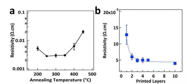 图4. 石墨烯/乙基纤维素体系电阻率与退火温度的关系(a)和打印层数与电阻率的关系