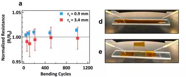 图5. PI基底印刷石墨烯的柔韧性评估。(a)石墨烯折弯半径为0.9mm(蓝色,弯曲应变:6.9%)和3.4 mm(红色,弯曲应变:1.8%)的电阻归一化至弯曲前的电阻。