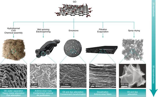 石墨烯基纳米片具有极高的理论比表面积,如氧化石墨烯(GO)高达2600 m2 g−1,结合其多功能化学性质,在水和空气处理方面产生了无数的应用前景。GO在水性介质中的高胶体稳定性,是水处理中实际应用的一个关键技术障碍,这限制了GO纳米片在去污处理后的回收率。将二维GO纳米片自组装成三维宏观结构(3DMs)解决了这一问题。多孔的3DMs正被开发用于任何比表面积限制性能的应用,如水和空气处理、超级电容器、电池和传感器。各种3DMs几何形状,如海绵、薄膜和纤维,正在考虑用于环境应用。然而,关于石墨烯基3DMs的材料性质与其环境性能之间的关系知之甚少。
