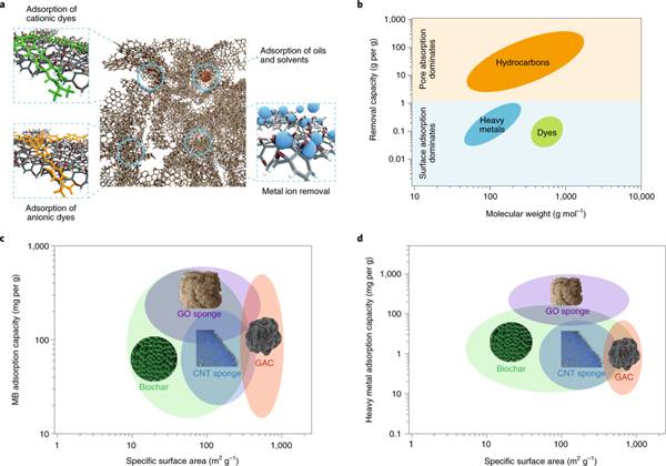 d,与c类似,根据其比表面积,将GO海绵的重金属吸附能力与其他类型的碳基3DMs(如CNT海绵,生物炭和GAC)进行比较。阴影区域显示了3DM吸附容量的范围及其相应的比表面积。GO海绵对重金属离子的吸附能力一般高于其他类型的3DMs。