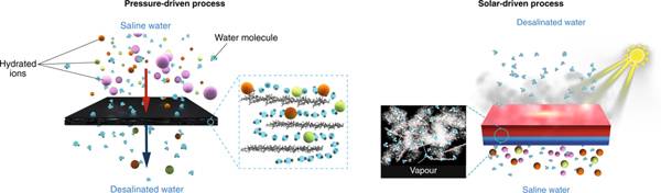 左图为压力驱动的海水淡化过程中自组装的层状结构GO膜。水分子和较小的物质穿过高度有序的堆叠纳米片之间的可调纳米通道,而具有较大尺寸的离子或分子被排斥。右图为一种薄膜,里面有松散的GO纳米片,用于太阳能驱动的海水淡化过程。在太阳能照明下,GO纳米片的宽带光吸收会在膜厚度上产生蒸汽压差,从而驱动水蒸气通过多孔GO膜,同时保留离子等非挥发性物质。