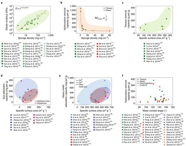 c-e,比表面积较大的海绵通常除去较大量的(c)甲苯,(d)染料和(e)重金属离子。