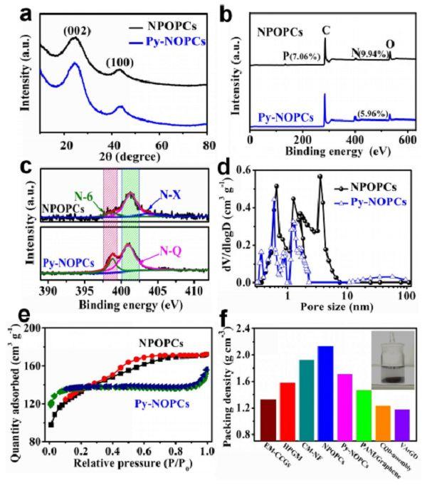要点解读:NPOPC的XPS如图2b,133.0 eV,284.6 eV,400.1 eV和532.0 eV处的四个峰可归因于磷(P 2p,7.06at%),碳(C 1s,72.40at%),氮( N 1s,9.94at%)和氧气(O 1s,10.61at%)。高分辨率XPS N 1s峰分别在398.3, 400.0和403.8 eV(图2c)解卷积成三个峰,分别对应于吡啶,石墨和氧化的N。其中,石墨N和吡啶N占所有N含量的93%以上,这有利于提高NPOPCs的电化学性能。两种碳材料的X射线衍射图(XRD)在约25.2°和42.5°处显示出两个宽的衍射峰,对应于石墨的(002)和(100)面。通过提高杂原子掺杂含量,半峰宽变得更宽并且峰值全部移动到更小的角度,如图2a所示,表明碳框架中的缺陷和层间d-间距增加。图2e为Py-NOPC和NPOPC的N2吸附等温线,其具有I/IV型等温线。在相对压力P/P0<0.1时CO2显着吸收证实了NPOPC的高微孔隙度(~0.6 nm和1.5 nm),并且在相对压力P/P0>0.3存在明显的II型滞后表明基于N2吸收的中孔(4 nm)。BET比表面积(SSA)计算为429.7 m2·g-1,孔体积为0.232 cm3·g-1。NPOPC的填充密度测定为2.13 g·cm-3(图2f),高于所有已知的多孔碳材料,并且与热解石墨(2.25 g·cm-3)相当,使其成为实现SCs高体积性能的可能替代材料。NPOPC在碘乙烷中沉淀的简单实验,进一步证实了其高密度,碘乙烷的密度为1.95 g·cm-3(图2f)。