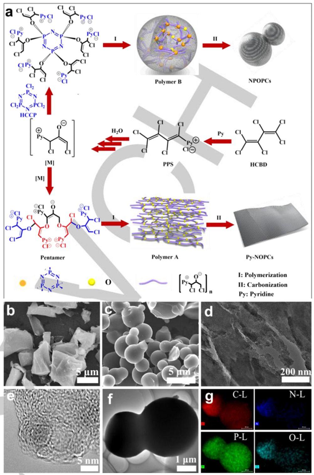 图1. a)Py-NOPC和NPOPC聚合和碳化示意图;