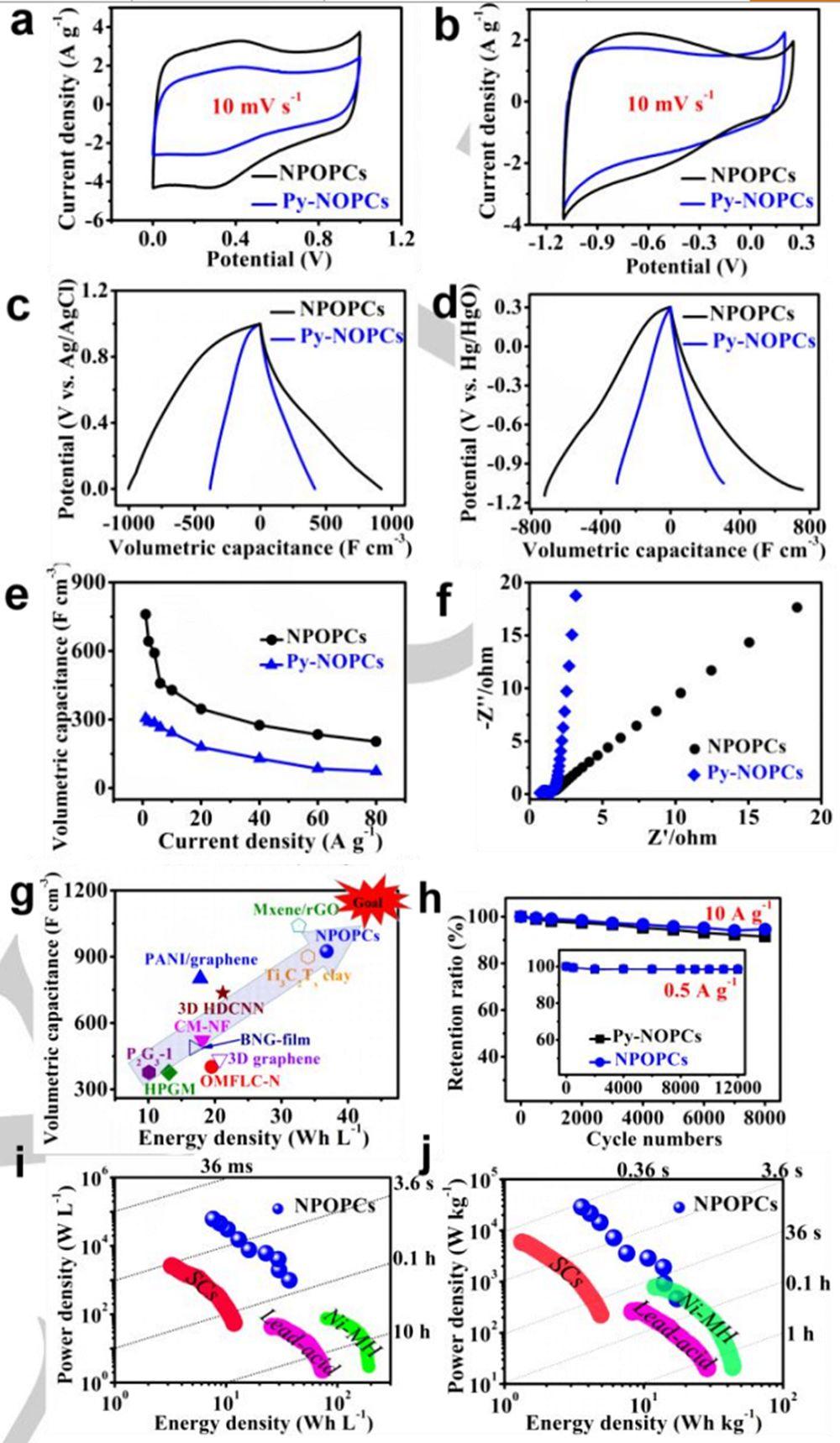 e)碱性电解质中NPOPC和Py-NOPC体积比电容与电流密度曲线;