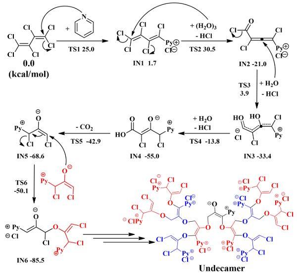要点解读:如原理图1中所示,杂原子掺杂碳的合成涉及六氯丁二烯(HCBD)和吡啶(Py)之间的亲电取代反应,以形成五氯丁二烯基吡啶鎓盐(PPS)。DFT计算表明PPS可以与H2O进行加成和取代反应,从而形成两性离子物质,这是进一步自聚合的关键中间体。值得注意的是,痕量的残留水对于脱卤反应至关重要。但是,由于原料中存在的H2O足以促进自聚合,因此不需要过量的H2O。水分测量显示HCBD和Py中的H2O含量分别为0.16%和0.79%。