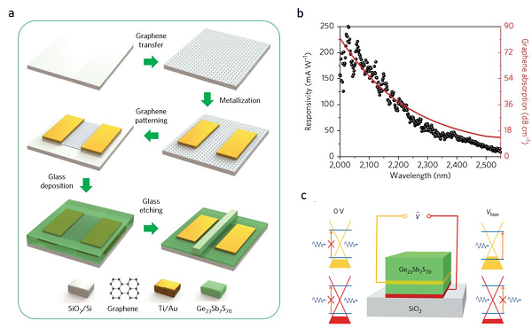 (a)器件制备示意图。(b)石墨烯中红外探测器光电响应测试结果。(c)中红外波导调制器。