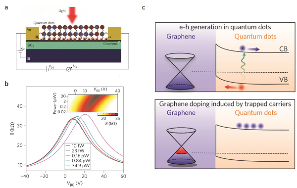 2012年ICFO的研究者在nature nanotechnology 上报导了硫化铅量子点(PbS QDs)/石墨烯晶体管型光电探测器,如图2所示[3],在该结构中PbS QDs做为主要的光吸收材料,由于量子点与石墨烯功函数不同,PbS QDs产生光生电子空穴对后,光生空穴会转移到石墨烯中,PbS QDs提升了器件的外量子效率;石墨烯作为载流子输运沟道,由于石墨烯载流子迁移率高、受到散射的概率较小,因此注入的载流子能使得沟道电阻发生明显变化。该探测器可以实现对近红外-可见光波段的光探测,器件的响应度达到~107 A W-1,探测度能达到71013 Jones。基于以上研究,2017年该小组在nature photonics上报导了388288个PbS QDs/石墨烯单元集成而成的CMOS成像系统[4],该成像系统可以在宽频谱的条件下(300-2000 nm)工作,这是目前商用COMS型相机无法实现的。