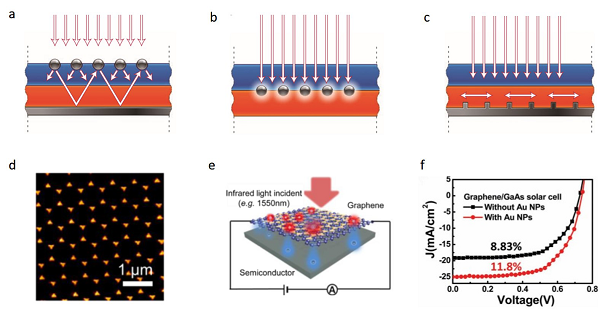 (a)金属纳米颗粒散射示意图。(b)金属纳米颗粒LSPR引起近场增强。(c)金属光栅/半导体界面的表面等离子激元。(d)三角形纳米金阵列。(e)修饰了纳米金的石墨烯光电探测器。(f)石墨烯砷化镓太阳能电池的I-V曲线。