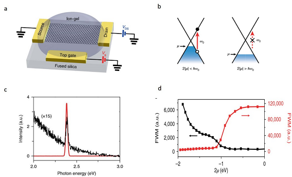 (a)离子凝胶栅控的石墨烯场效应晶体管示意图。(b)石墨烯光生载流子跃迁示意图。器件THG信号测量结果(c)、FWM信号与2u关系曲线。