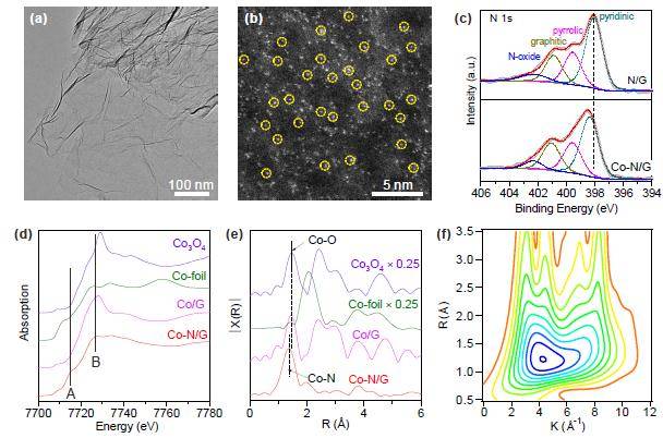 d) Co-N/G、Co/G、Co箔和Co3O4的XANES光谱;