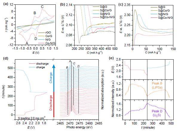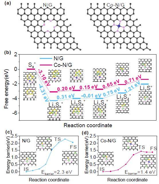 a) 第一性原理计算中使用的N/G和Co-N/G的结构,其中棕色、黄色、绿色、浅蓝色和深蓝色球分别代表C、S、Li、N和Co原子(下同);