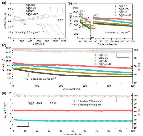 d) 0.2 C时S面积负载量为2.0、3.4和6.0 mg·cm-2时,S@Co-N/G电极的循环性能。