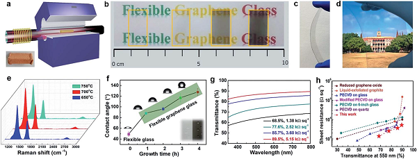 (c-d)具有良好柔性的石墨烯玻璃实物照片;