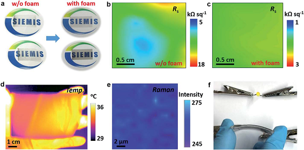 (b-c)在柔性玻璃上常规生长和泡沫铜辅助生长石墨烯的面电阻mapping图;