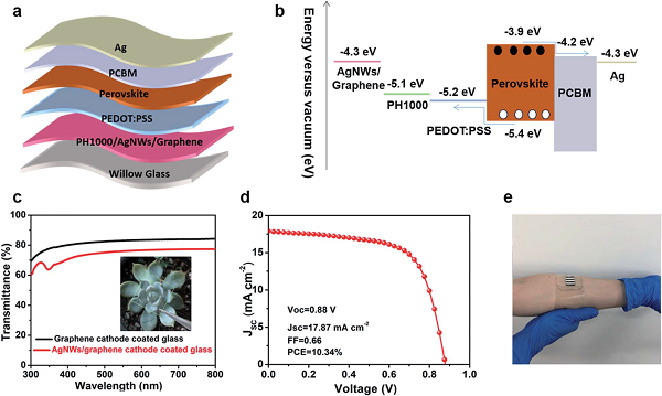 (a)基于柔性石墨烯玻璃的钙钛矿太阳能电池结构示意图;