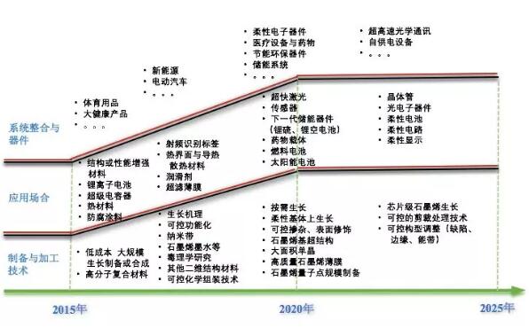 重点关注石墨烯产业化市场应用领域,布局石墨烯在新能源,电能替代,涂料等领域的市场化应用;同时关注目前在研发阶段的石墨烯在电子信息,生物医药领域的应用,抓住石墨烯应用启动良机,按照石墨烯产业发展图线图有序推进。下图所示为CGIA Research规划的石墨烯产业发展路线图,2018年-2020年,产业化发展重点集中于石墨烯产业链的延伸及对不同领域的引领作用,通过石墨烯材料的开发,全面拓展石墨烯在新能源、大健康、节能环保、化工等领域的产业化产业集群。同时,逐渐拓展石墨烯在电子薄膜、电子器件等领域的产业化进程;到2025年,石墨烯在高品质单层石墨烯薄膜,柔性显示,光电器件,纳米载药等方向实现产业化应用。