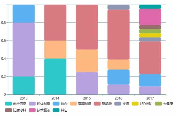 CGIA Research统计了每年不同领域的投资并购事件所占比例,如图2所示,整体来看石墨烯粉体和薄膜制备所占比例最大,在下游应用方面,新能源领域的投资并购事件最多。2013-2015年主要投资并购方向为石墨烯粉体薄膜制备及新能源应用,从2016-2017年开始向下游应用领域拓展,2017年投资并购事件的涉及的方向含粉体制备、新能源、大健康、防腐涂料、LED照明以及综合业务方向。