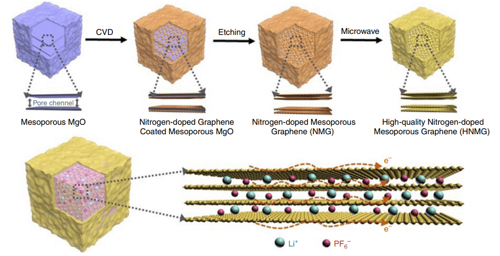 加州大学洛杉矶分校Yunfeng Lu、北京科技大学Ge Wang和河北廊坊ENN集团Jinlai Li等人以中孔MgO作为模板和催化剂,使用乙腈作为前体,通过化学气相沉积在MgO颗粒内生长氮掺杂石墨烯,去除模板后形成氮掺杂的中孔石墨烯颗粒(NMG)。其中,石墨烯在MgO内的生长是通过烃的自由基缩合实现的。与金属催化剂相比,MgO通常导致石墨烯材料具有更高的缺陷密度,这可以通过随后的微波辐射来降低,并且因此合成高质量的氮掺杂中孔石墨烯(HNMG)颗粒。