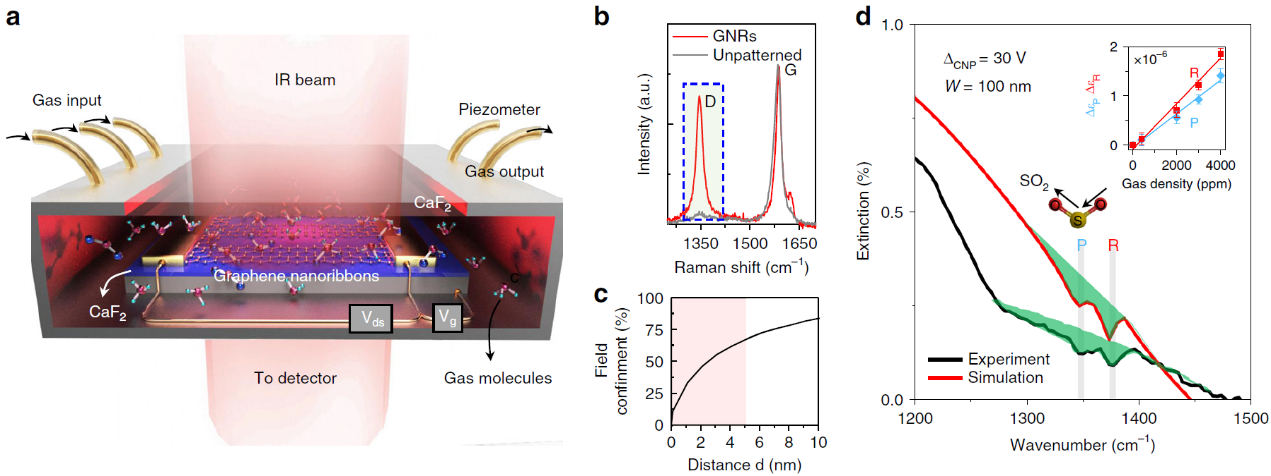 Figure 1. 用于进行气体识别的石墨烯等离子体装置。a)实验设备的示意图,带有渗压计的金属腔用于精确控制气体参数。使用入射红外光束激发石墨烯带阵列中的等离子体,并通过栅极电压(Vg)的静电掺杂进行原位调谐。等离子体与激发分子耦合,从而探测气体分子的旋转振动光谱;b)石墨烯纳米带(GNR)的拉曼光谱与其中一个未图案化的石墨烯片的比较;c)典型的GNR的等离子被限制的带宽为70nm;d)用于SO2气体鉴定的GNRs的实验(黑色曲线)和模拟(红色曲线)消光光谱。