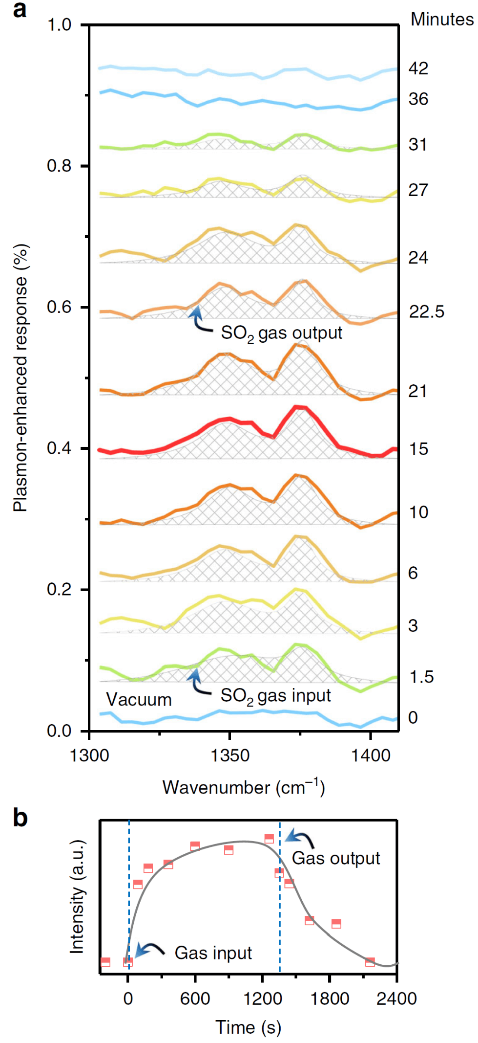 进一步研究所设计的设备的实时相应,记录一系列消光光谱,同时将SO2气体加入,然后从室中洗出。如图所示,在将SO2气体引入室中1.5分钟后记录的消光光谱中,P和R模式的突出峰开始可辨别,这表明SO2分子进入腔室并在1.5分钟内依靠可检测量的气体分子的物理吸附重新分布到石墨烯层上,随后,检测到的信号继续增加并在15分钟后达到最大值。这表明在15分钟后石墨烯装置上的气体分子的物理吸附浓度达到峰值。纯的N2气体被引入之后,SO2被解吸,这造成了的SO2等离子体增强的IR响应的逐渐降低,在图2b中也观察到快速解吸。结果清楚地表明我们的设备可以对气体分子进行实时监测,并且可以用N2重复使用流动,去除物理吸附的分子。