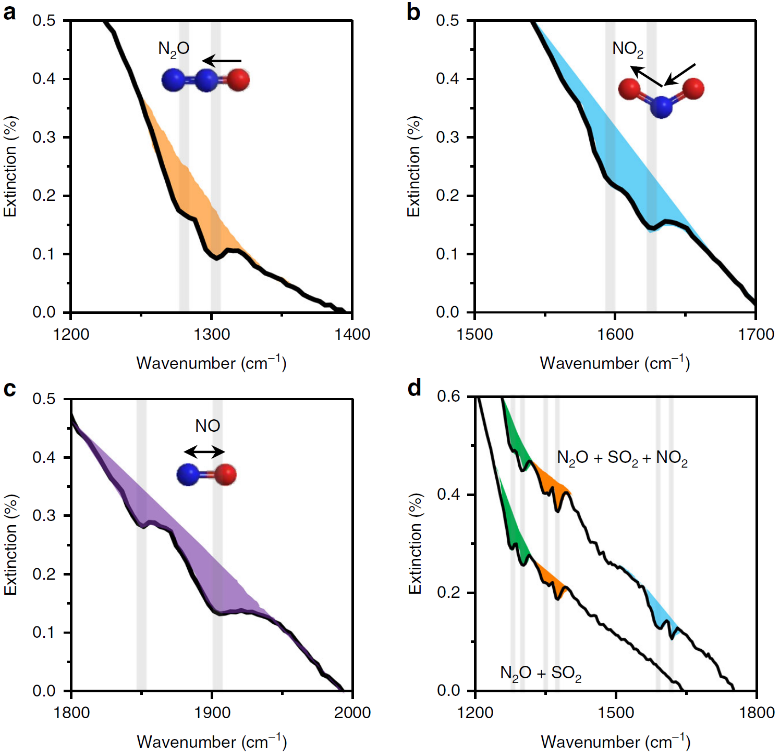 Figure 3. 不同氮氧化物的鉴定。a-c)分别表示在N2O,NO2和NO的存在下,石墨烯的消光光谱,该旋转振动模式用垂直线标记;d)石墨烯在两种混合物气体存在下的消光光谱,一种由NO2,SO2和N2O组成,另一种有SO2和N2O组成。