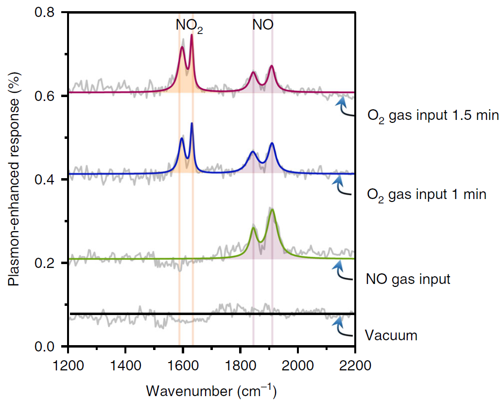 实时准确地识别气体分子是非常有用的,例如监测气相化学反应。在图4中,测得等离子体增强响应,这些实时测量具有高度选择性,能够直接观察化学反应,这些反应在需要分析原位化学反应的应用中具有很大的潜力。