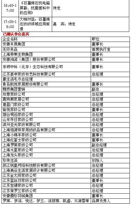 参会对象:知名纺织品企业高管、纺织领域院所专家、石墨烯材料制备企业、石墨烯功能面料企业、石墨烯功能纺织服饰产品企业等
